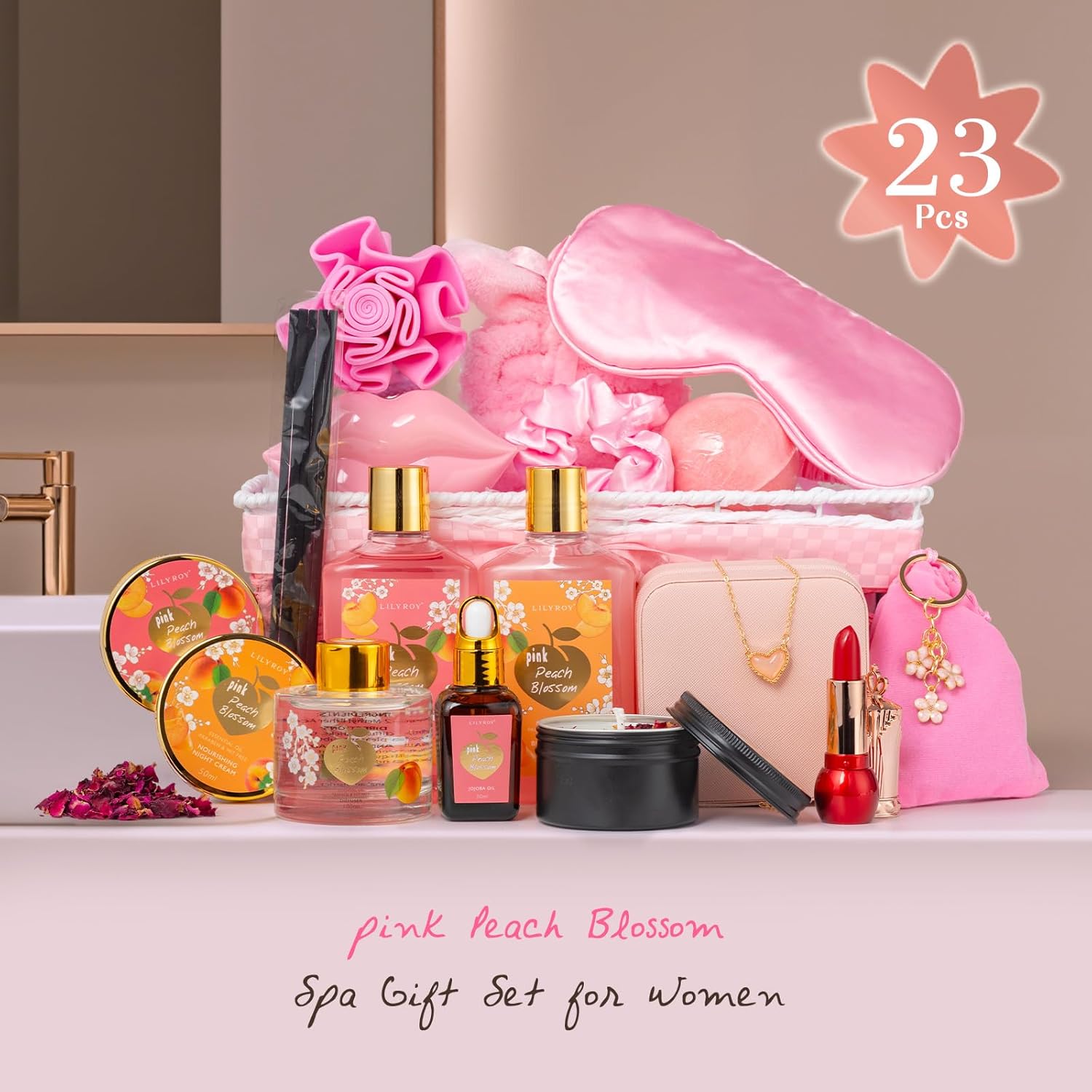- 25PCS SPA GIFT BASKET: Shower Gel, Body Lotion, Bubble Bath, Diffuser Oil, Soy Candle, Jojoba Oil, Bath Bomb, Bath Salt, Day Cream, Night Cream, EVA Sponge, 9pcs Rose Petal Soap, Dry Flower, Keychain, Necklace, Reed Diffuser Stick packaged in a nice beautiful basket. The spa gift baskets for women offer the most luxurious and perfect bath experience