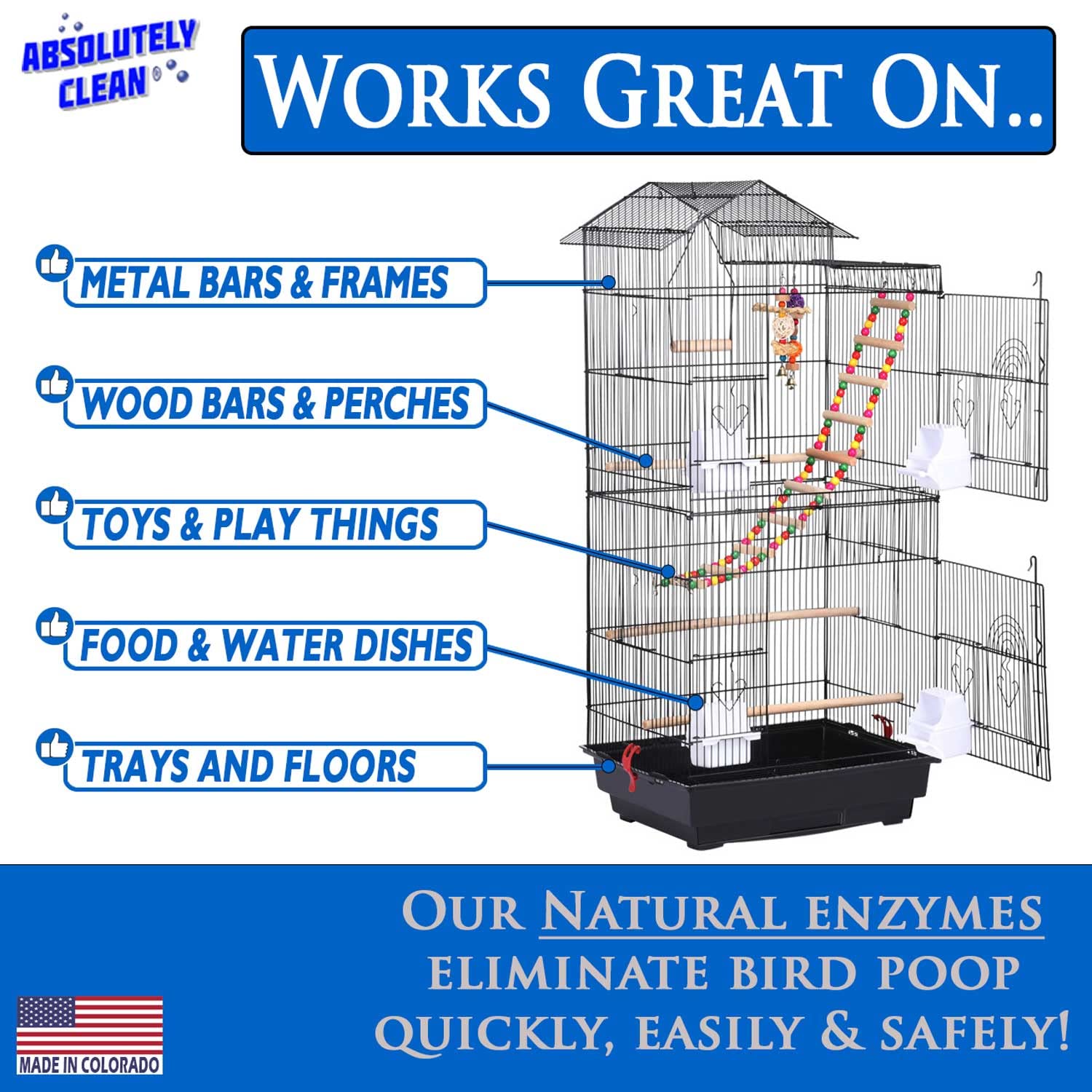 - POWERFUL NATURAL ENZYMES: Absolutely Clean Amazing Bird Cage Cleaner stain remover uses Powerful, Natural Enzymes to break down the smell and tough debris from bird droppings in your bird cage. Our bird cage accessories does not give off the noxious fumes that you’ll find with other cleaners making for a more pleasant cleaning experience. Effortlessly remove bird poop off with the cleaning supplies of Absolutely Clean Amazing Bird Poop Remover.