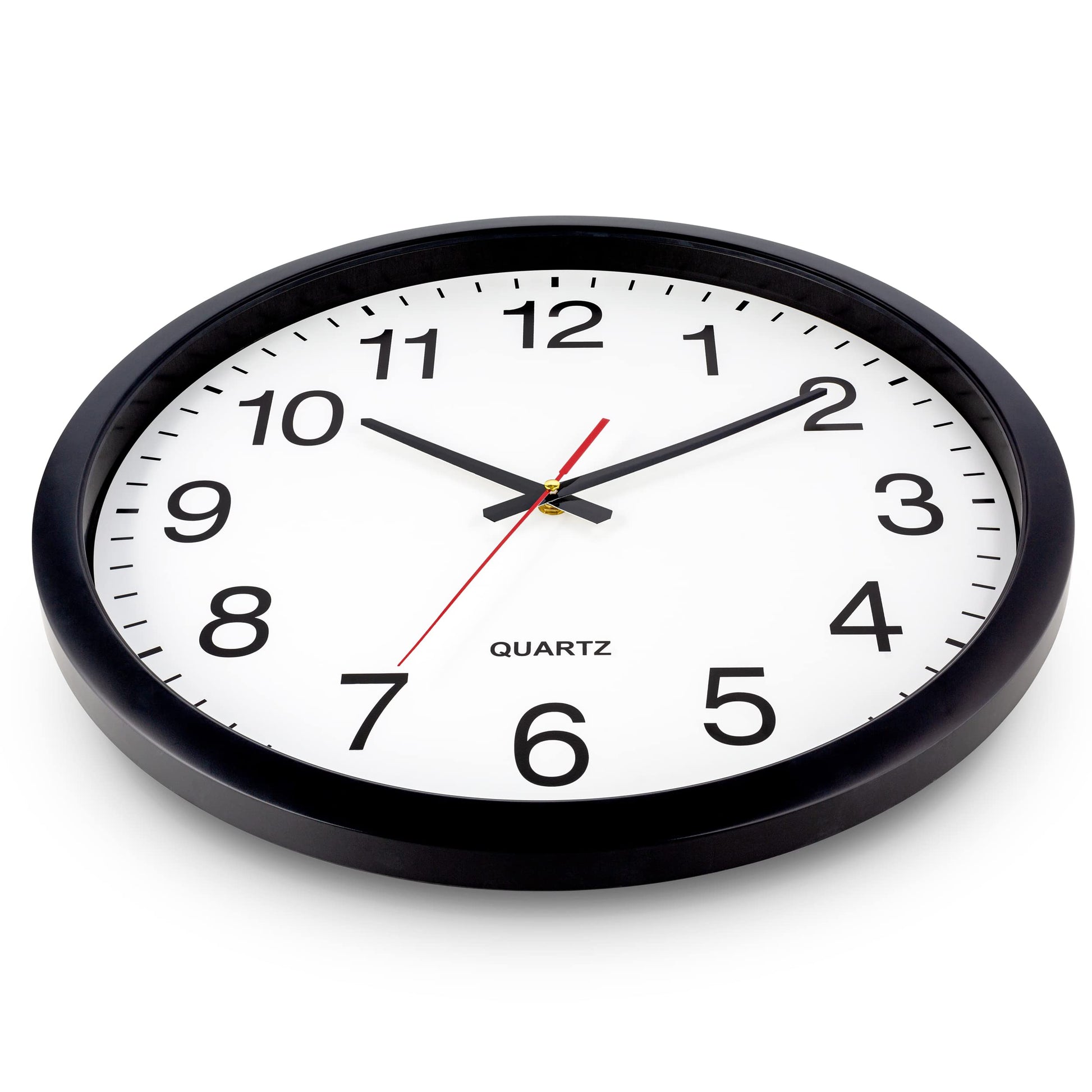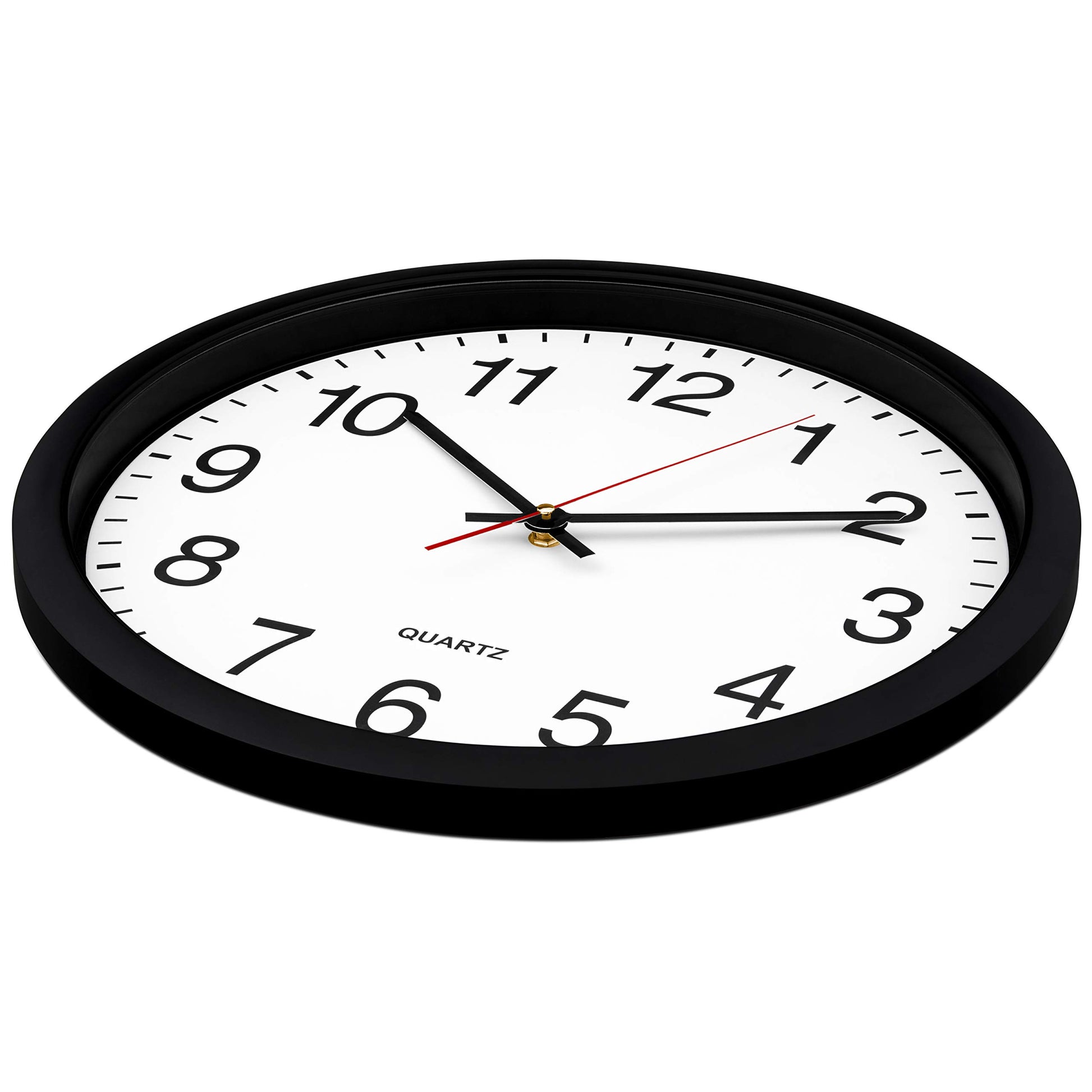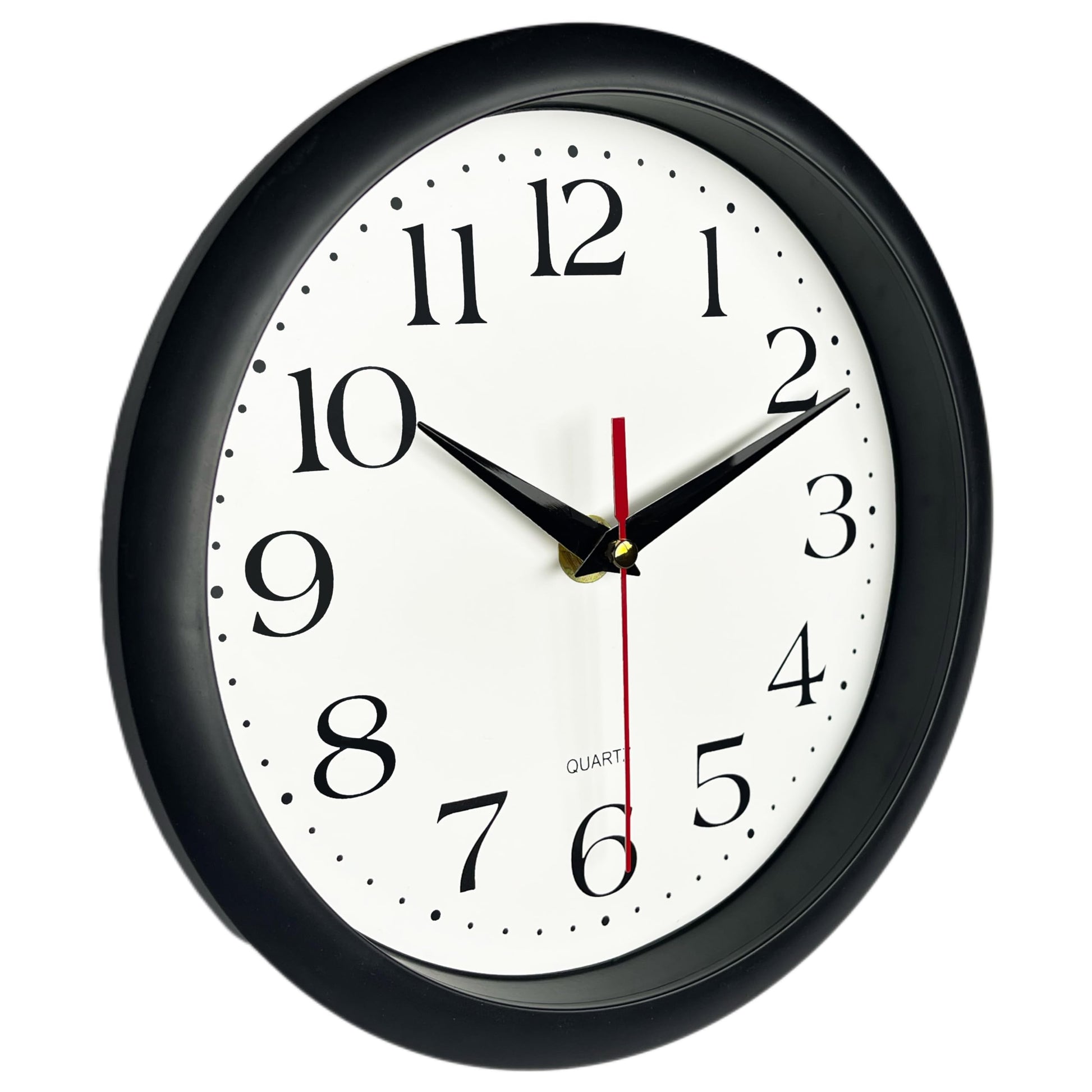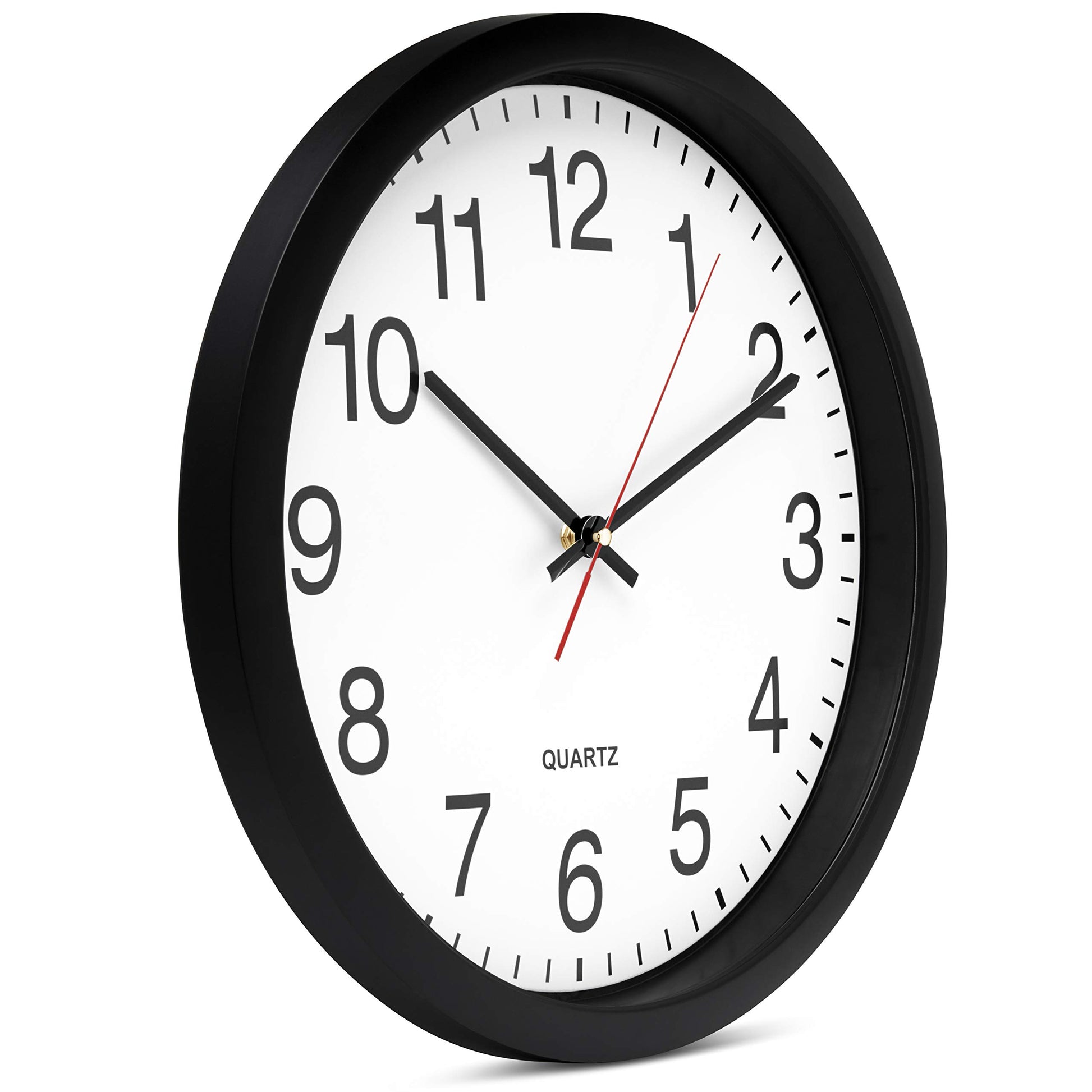 - 10 Inch clock. Large black bold numbers against white face background creates easy viewing. Precise Quartz movements guarantee accurate time