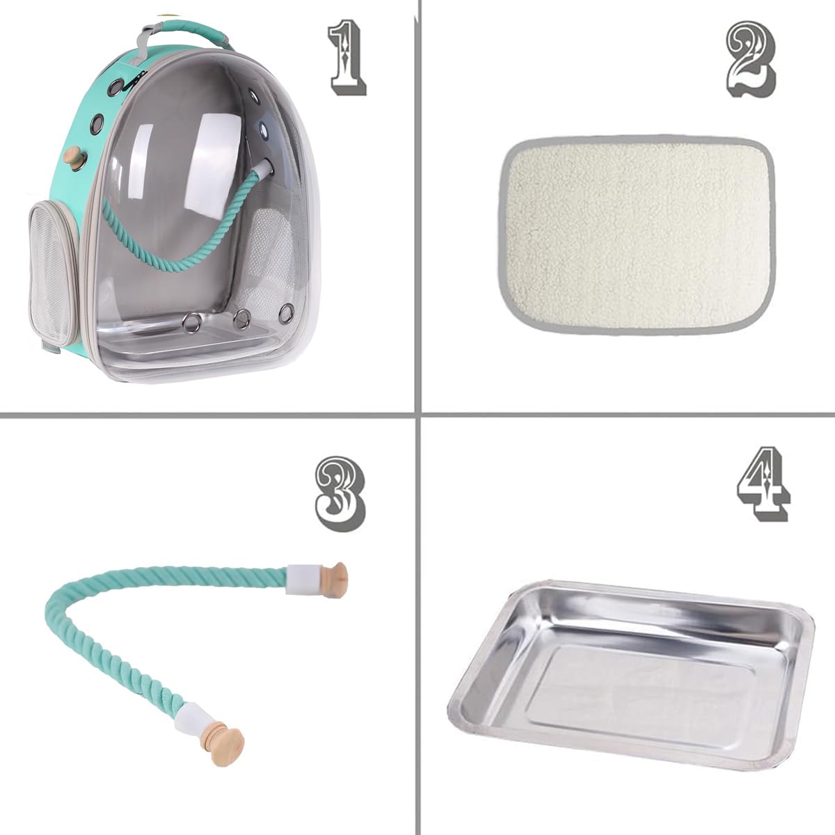 - Package includes 1 bird backpack + 1 stainless steel tray + 1 velvet lined soft mat + 1 (ONE) Cotton rope perch