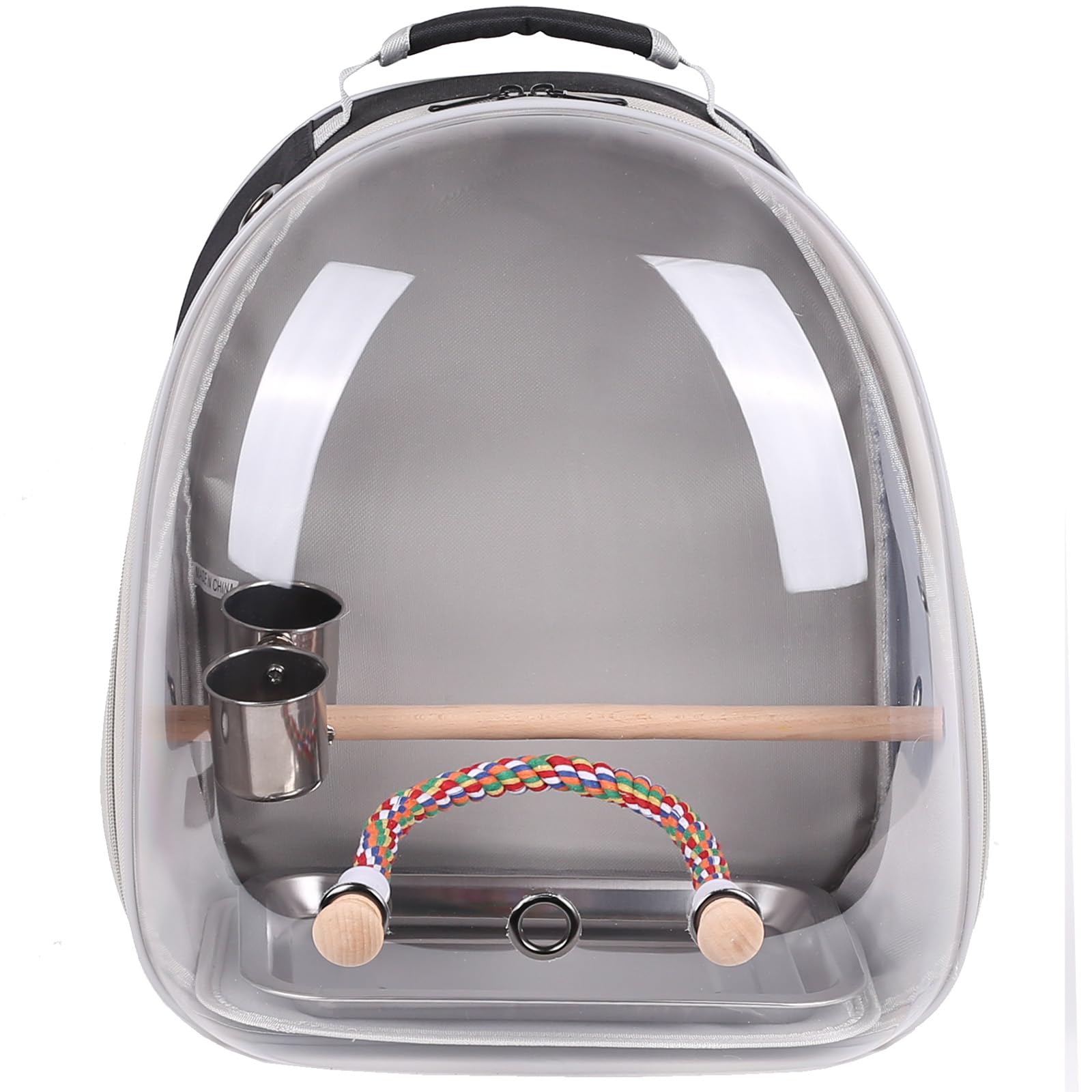 - Bird Travel Carrier Cage. Space capsule liked bird travel backpack, pet safe transparent hard shell protects your bird better. Great bird travel backpack with stand perch and tray included.