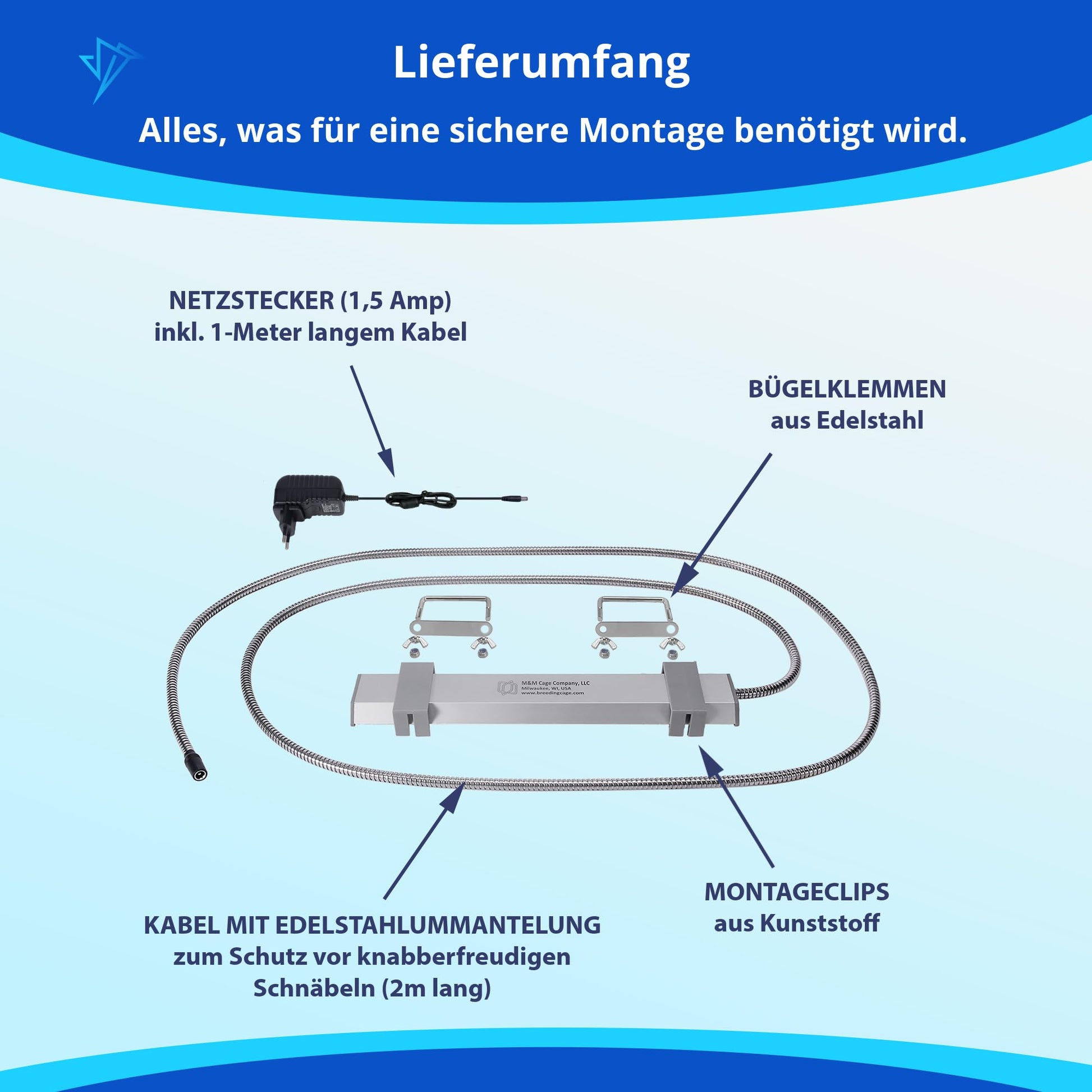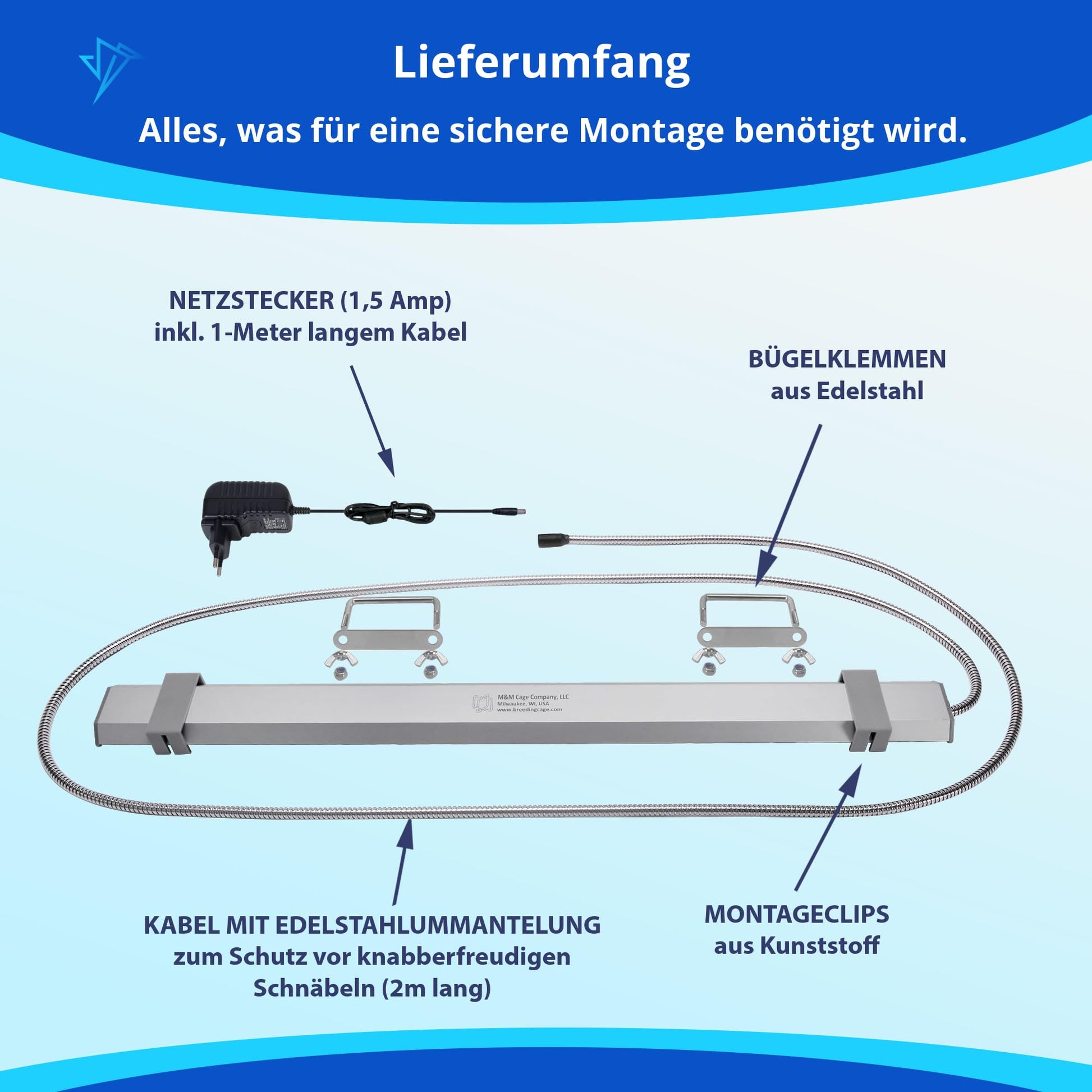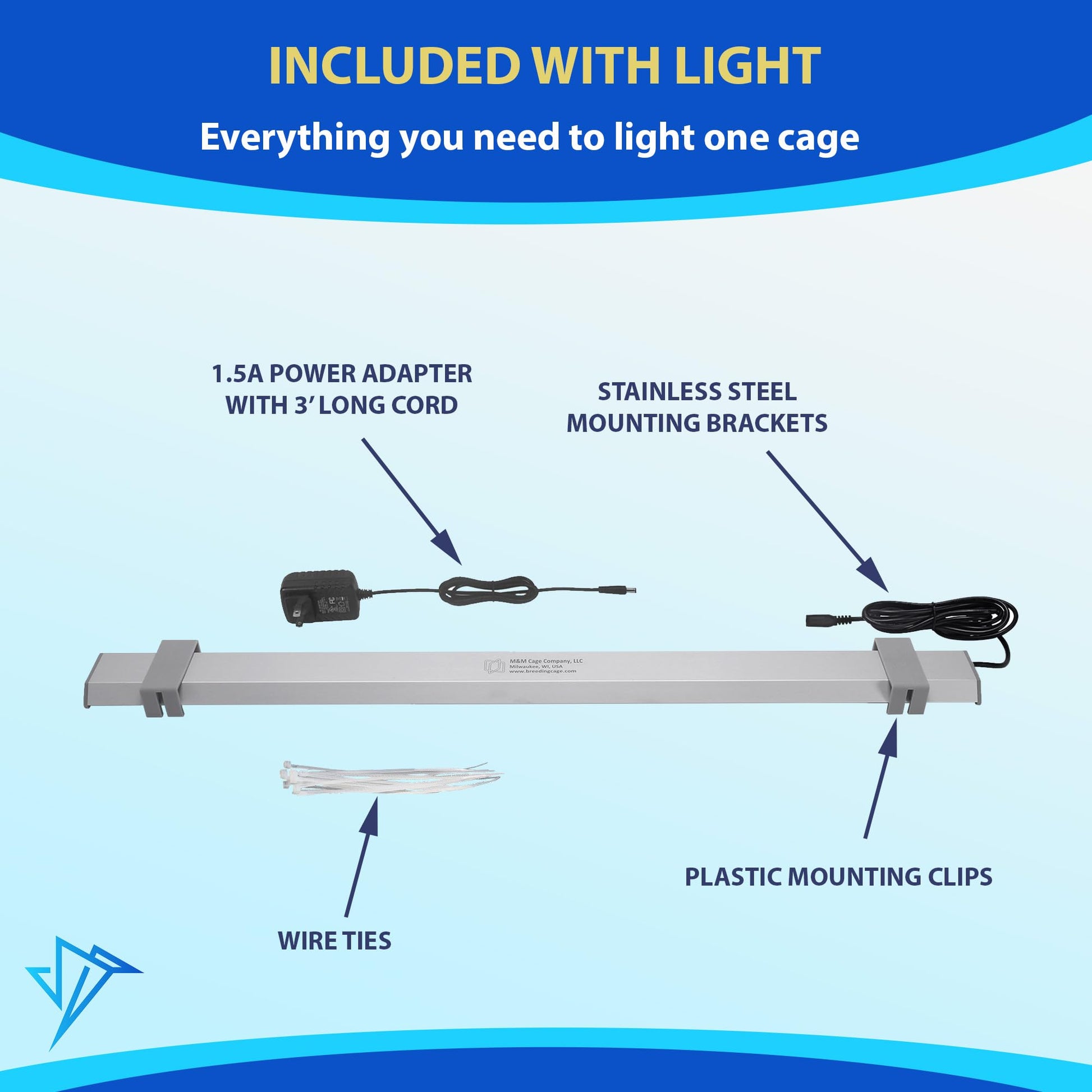 - ECONOMICAL: M&M Cage lights come with everything you need to safely install and use your lights, including power supply, mounting hardware, and stainless steel wire ties. With no pricey bulbs to replace and water-resistant housing for worry-free cleaning, you and your bird will enjoy our light for years.
