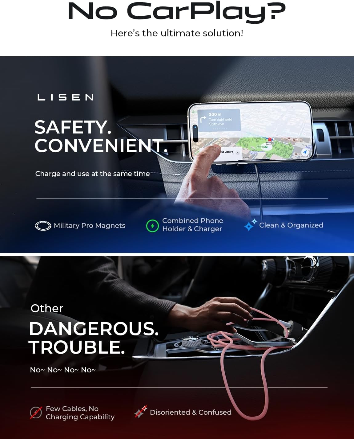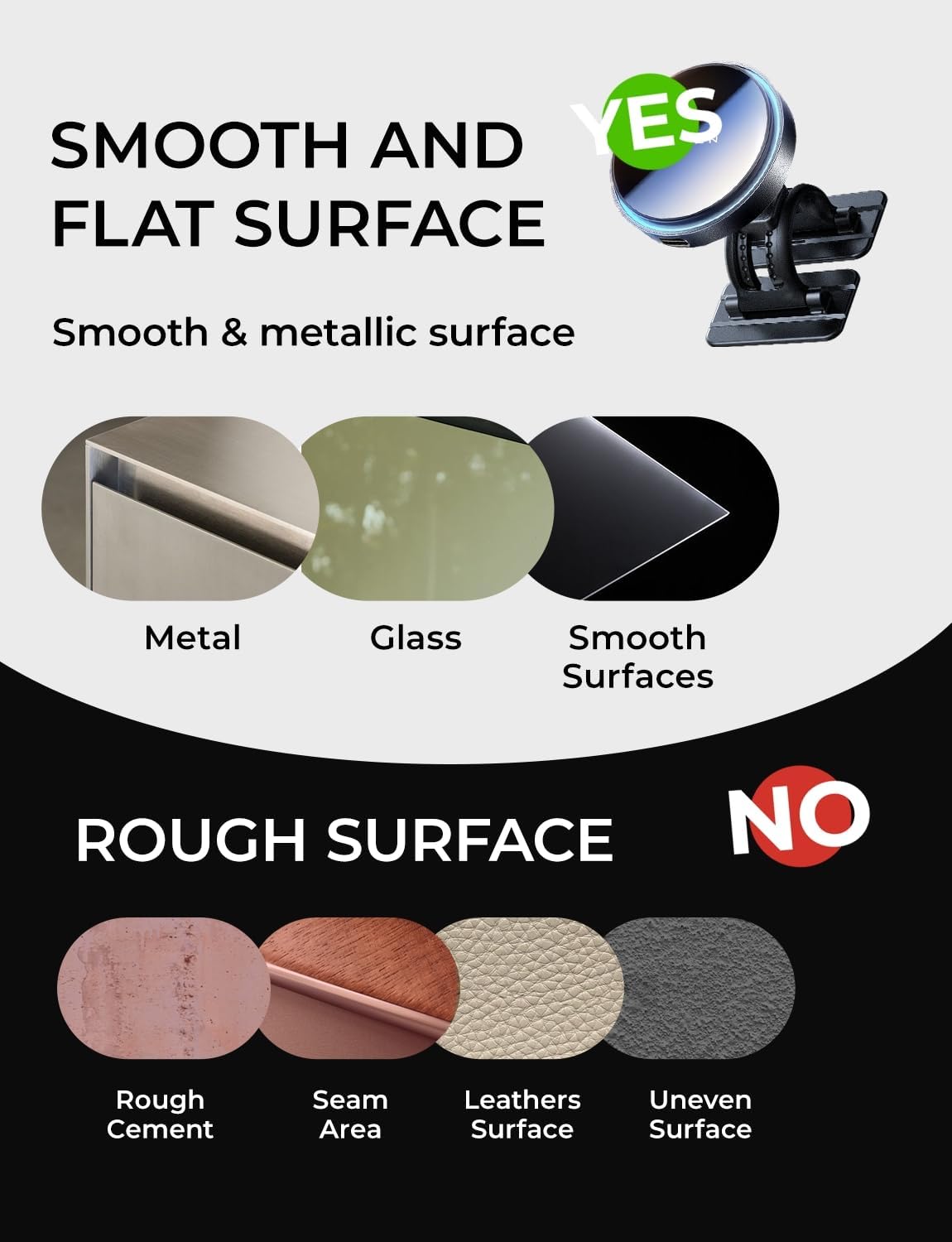 - Premium Design:The LISEN MagSafe Car Wireless Charging Mount for iPhone uses official Tora-TC Heat Sink for long-term, stable use, ensuring superior quality and functionality compared to other products.Tips: 1 Ensure the base sticker is correctly positioned and securely adhered once to avoid weakening the adhesive from adjustments 2.Stick it on a smooth car surface as miuch as possible. If it is pasted on an uneven surface, there may be a risk of falling.Does not support sticking in RoughCement、Seam Area、Leathers Surface、Uneven Surface