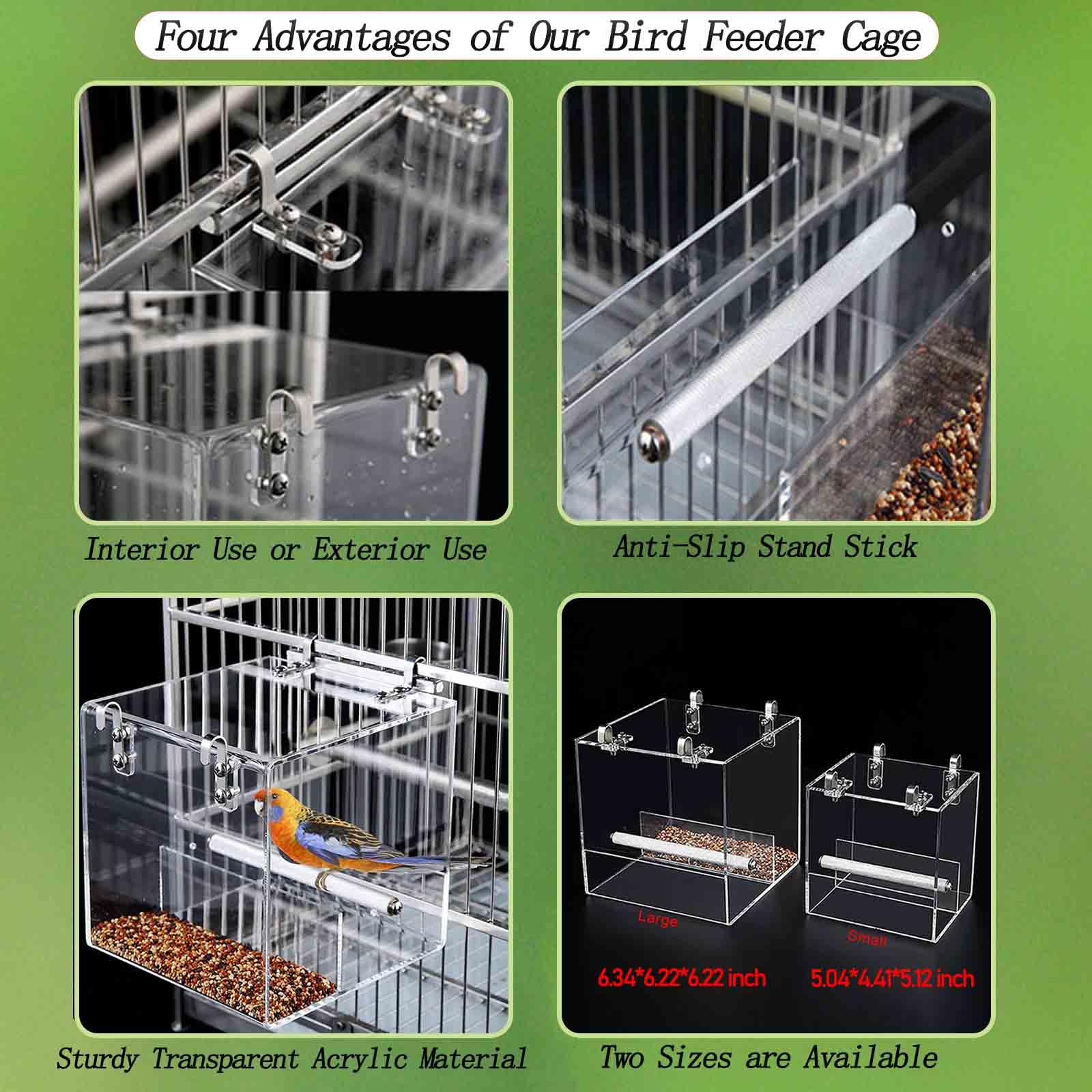 - HEALTHY MATERIAL: Our bird feeder cage is made of clear acrylic, which is thick, safe, non-leakage, and easy to clean. The hooks used to secure the cage are made of high quality stainless steel and are rust-resistant, sturdy and durable