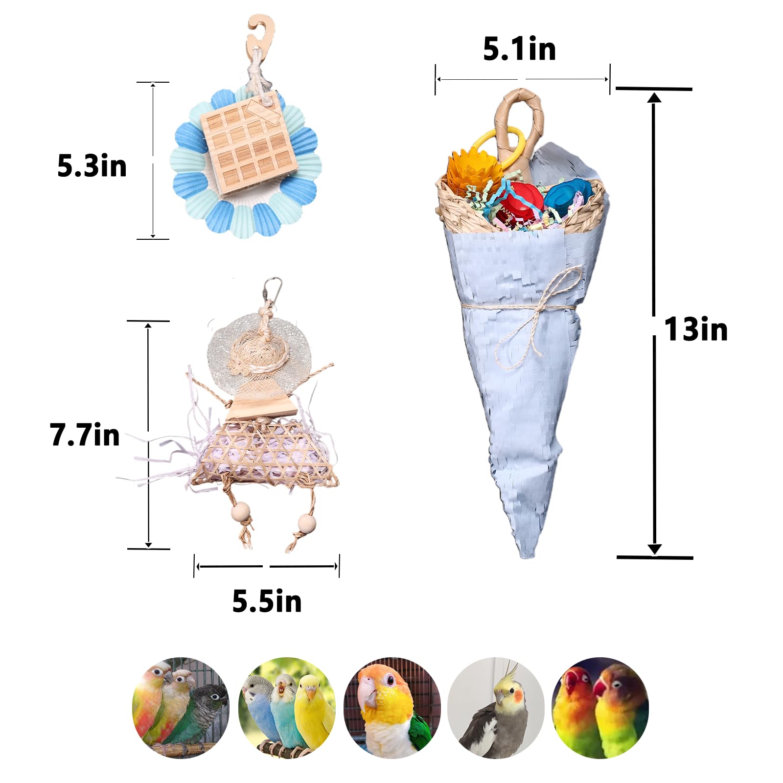 Parrot Chew Toys Set - Natural Wood & Loofah Toys with Plant-Based Dyes, 3 Pack Bird Chew Toys for Cockatiels, Conures & Small Parrots for Cage Enrichment (3 Pieces of Blue Series)