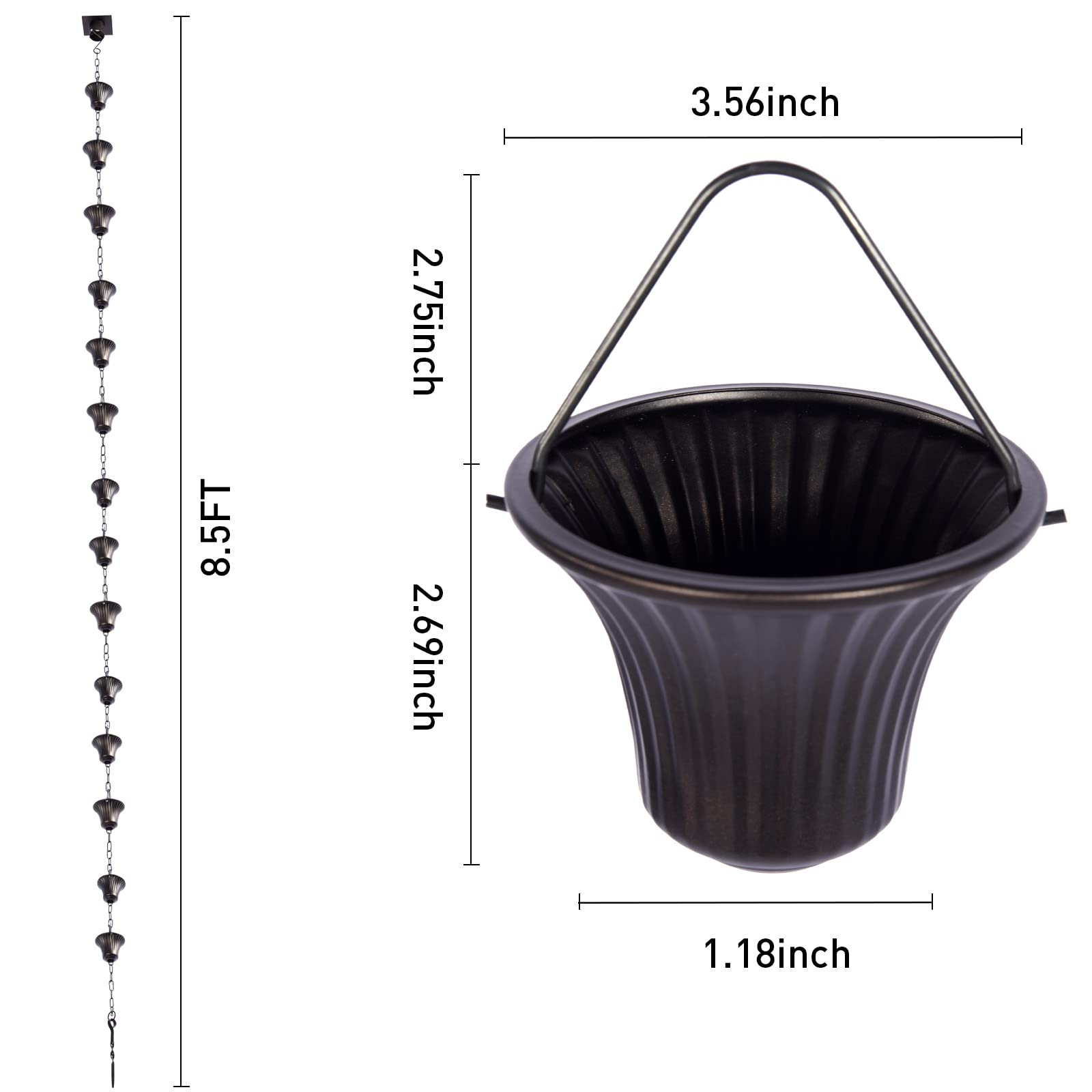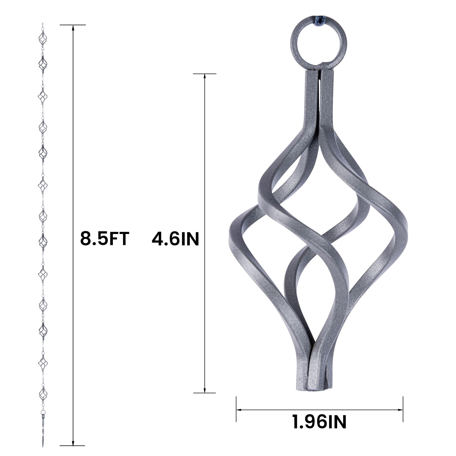 - Rain Chain Size: The birdcage rain chains of 8.5 ft long can play a beautiful rain song for you. The rain gutter chains combined of 13 birdcages of 2.5 inches in width and 4.6 inches in height as well as chain, really lovely for what it looks like. The outdoor rain chain is good at guiding the flow of rainwater, while listening to the music played by the rain chain, you will be touched by the charm of life from the nature.