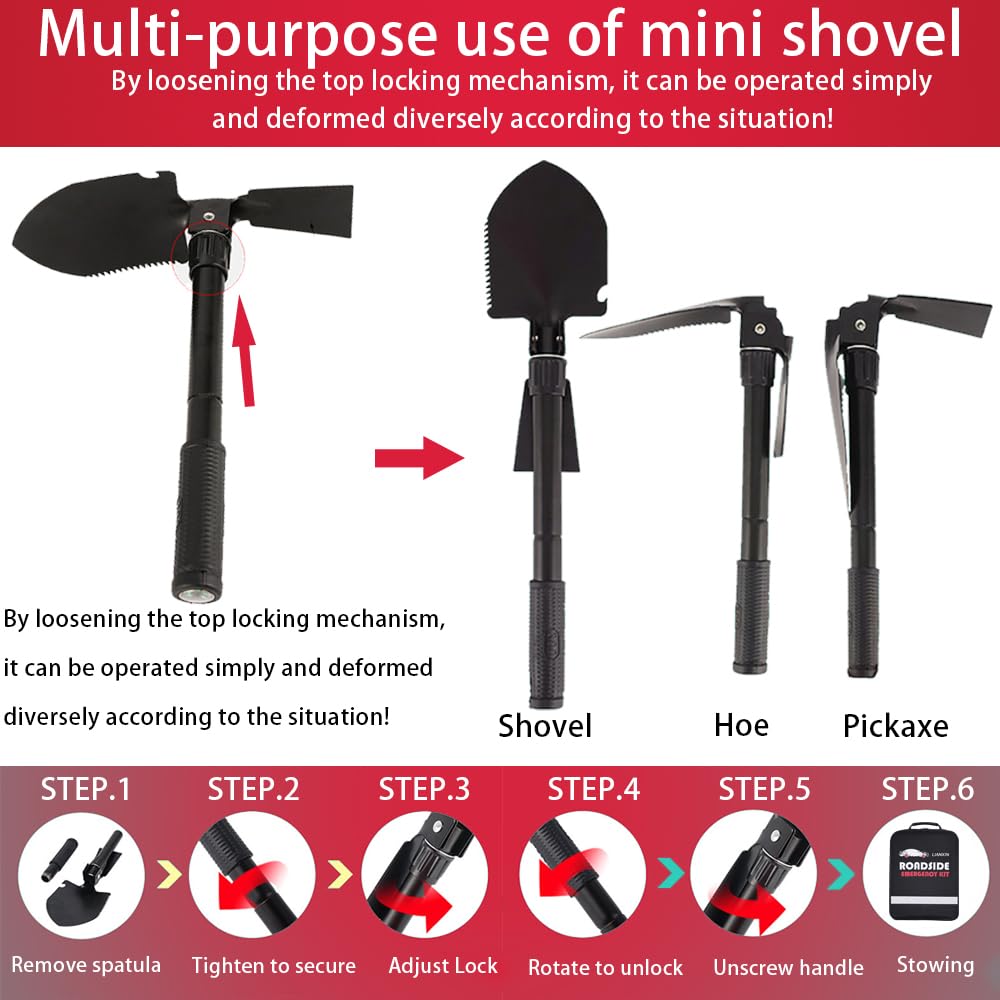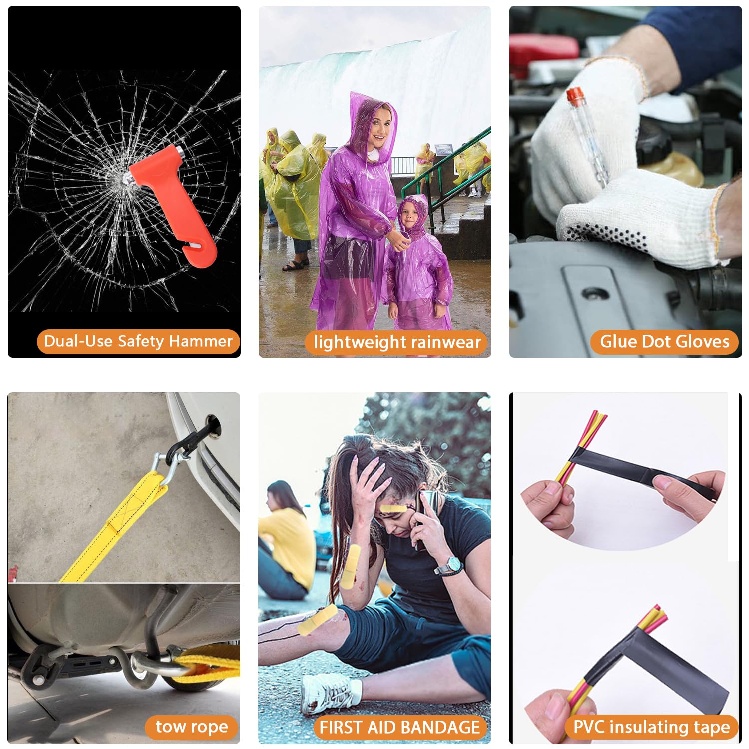 - 【Emergency car kit】: This emergency kit car, It’s lightweight, compact. that can fit anywhere in your backseat, trunk or even in your spare tire compartment, can handle unexpected things,it also includes preparedness survival tools for outdoor activities like camping, hiking, hunting, act. perfect for family use at home.