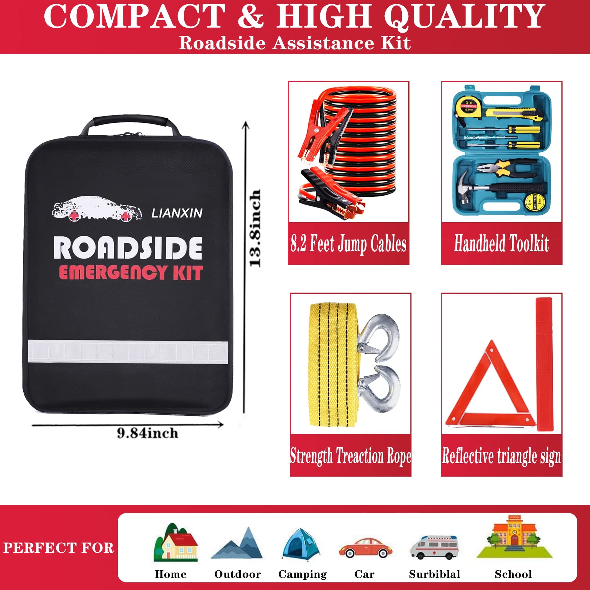 Roadside Assistance Emergency Kit - Car Emergency Kit with Jumper Cables (Upgraded) Emergency Roadside Kit for Car 142 Pieces Car Safety Kits,Tow Strap,Tool Kit,Reflective Warning Triangle