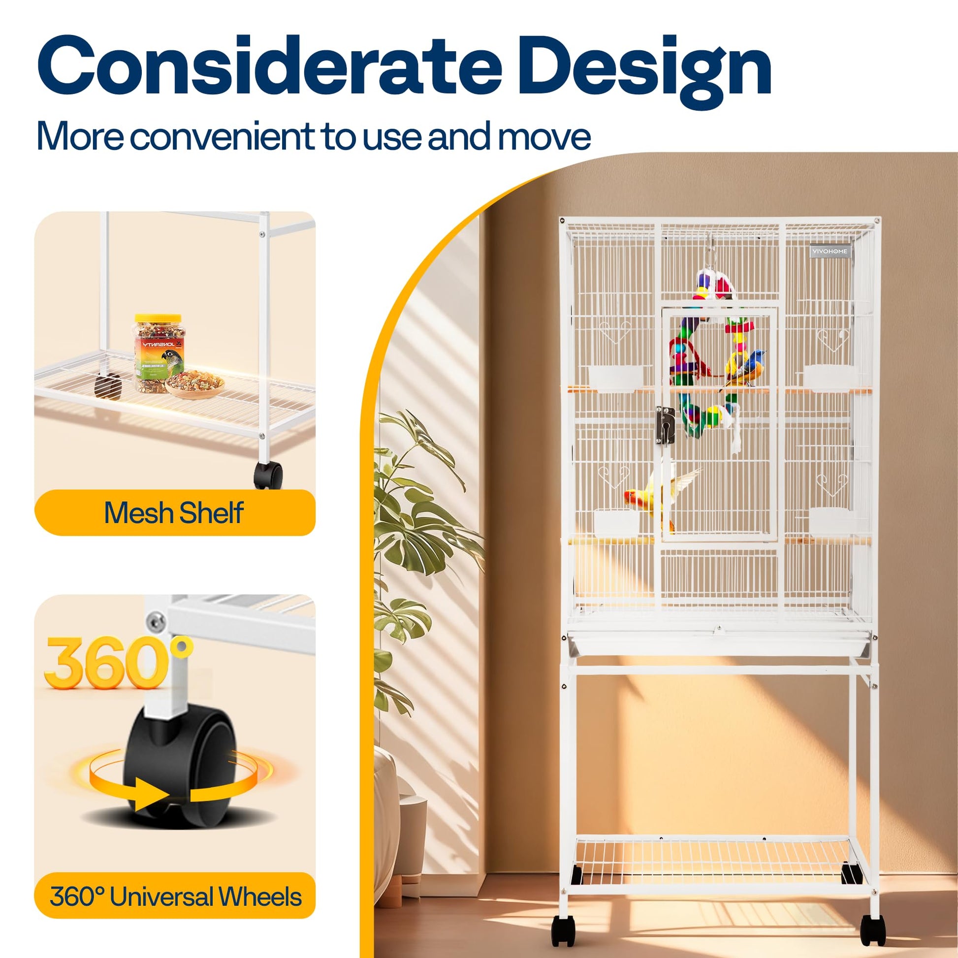 - CONSIDERATE DESIGN - With the design of the considerate 4 universal casters, you can put the cage where you want and it will not run anywhere; The unique latch design is firm and safe, which can prevent the bird from opening the door by itself and ensure the protection; The perch is designed to fit the size of a bird's feet and the breeding box can be hung on either side of the cage