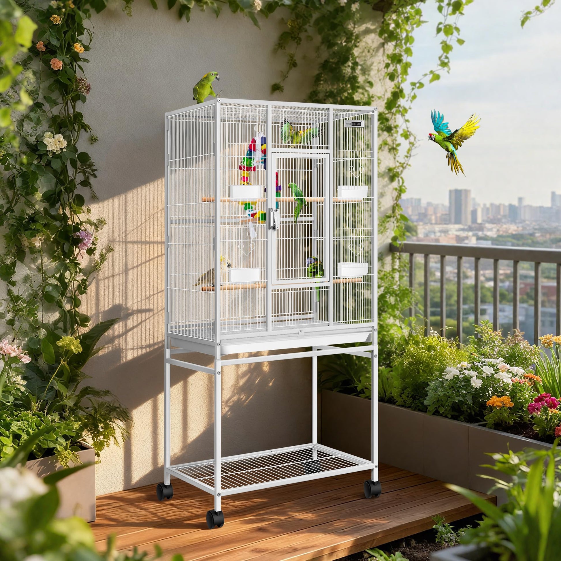 - MULTIPLE FUNCTIONS - The design with a flat top gives you more free space to hang bird toys or put some potted plants to decorate the appearance of your cage, increasing the enjoyment of the bird cage; Different decorations and useful equipment can be hung on either side of the cage or put on the mesh shelf